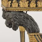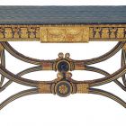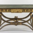 Négy aranyozott, levéldíszes, csigavonalból indított ívelő lábát, egy-egy faragott ornamens – középen rozetta, a széleken oroszlánfej – díszíti és esztergályozott rúd merevíti. A pávakék selyemripsszel bevont tégla alakú lap alatti káván, három oldalon cseppsor fölött, gazdag faragott akantuszlevélsor vonul végig.