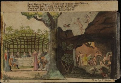 Három részre osztott képecske. Bal oldalon pergola alatt lakomázó társaság. Középütt tájban hölgy előtt térdelő gavallér. Jobbra sziklákról lezúduló vízesés, másik oldalán rémisztő álomkép: pokolbéli jelenet figurákkal, keveréklényekkel. Az első két idillikus ábrázolás felett négy soros felirat: „ Quält dich die schwarze nacht mit schauervollen Bildern, Und ängstigt dein Gemüth die grause Traumgestalt: Dann wecke dich der mun... Tanz, die volle Tafel, Und sanft erfüll dein Herz der Liebe Allgewalt. „