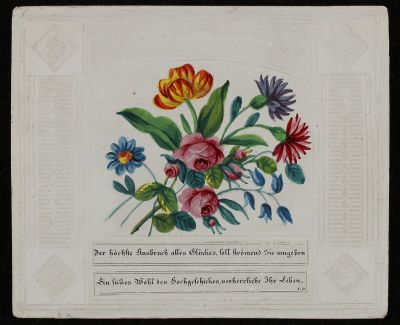 Fehér, préselt keretezésű kártyalap egyszerű geometrikus és stilizált virágmotívumokkal. Középen a biedermeier ízlése szerint többféle virágból összeválogatott, kézzel festett csokor, feltehetően Joseph Riedl műve, aki a kor festői előírásai szerint járt el, amikor – amint itt-ott még látható – ceruzával igen pontosan papírra vetette a virágok alapvető körvonalait, mielőtt megfestette volna őket grafikus karakterű, aprólékos stílusban. A csokor alatt gót betűs felirat: Der höchste Ausbruch alles Glückes, soll strömend Sie umgeben / Ein süsses Wohl des Hochgeschickes, verherrliche Ihr Leben.