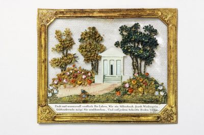Virágokban pompázó (rózsa, nefelejcs, tulipán) fás ligetben timpanonnal koronázott építmény (valószínű a barátság, a harmónia temploma) oszlopos előcsarnokkal, magas lábazaton, a bejárathoz lépcső vezet fel. Alul a következő felirat látható: Froh und wonnevoll verfliess Ihr Leben, Wie ein Silberbach durch Wiesengrün / Götterfreude möge Sie umschweben, Und aufjedem Schritte Rosen blüh'n. I. E. A fémkeret egyszerű tagolású, a sarkokban stilizált, szimmetrikus díszek.