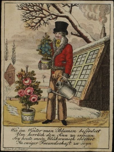cserépben, jobb kezében virágzó nefelejcs, szintén cserépben, baljában pedig öntözőkannát tart. Alul négy soros felirat: „Wie im Winter man Blumen befördet Um herrlich den Sinn erfreun Sey heute mein Glückwunsch erörtert In ewiger Freundschaft zu seyn” .