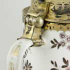 A testen aranyozással kontúrozott, barnás árnyalatú schwarzlottal festett chinoiserie jelenet: rácsmotívumokból kialakított kerítés előtt álló kínai figura, fantasztikus madarakkal.