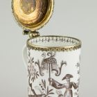 Alacsony, kihajló peremű, vonal-, hullám- és pontsorból kialakított díszítésű, aranyozott ezüsttalpon egyenes falú hengeres test, körbefutó rács-, lomb- és szalagdíszes, enyhén boltozatos, lapos, akantuszleveles billentőjű fedéllel.