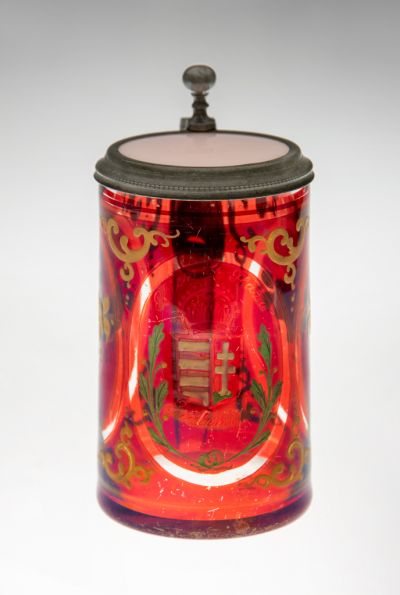 Technika: | aranyozott; formába fúvott; melegen feltett fülell; rézrubin pácolt; színes zománcfestés |
