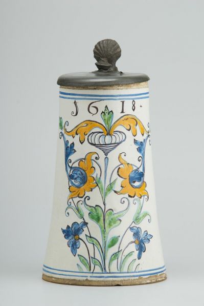 Díszítése talpát és száját szegélyező kettős kék csík. Az edény hasán fehér alapon elöl mangánnal és kékkel kontúrozott kék, zöld és sárga stilizált virágtő, felette 1618-as évszám.