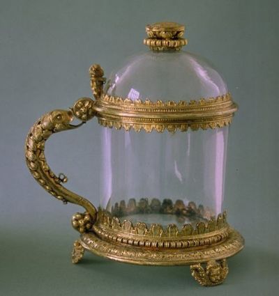 Az edény hengeres teste és a félgömb alakú fedele csiszolt hegyikristály. Foglalata: talp- és szájperem, a fedél pereme, gombja és a fogó aranyozott ezüst. A fedél gombján vésett címer – pajzsát oldalnézetben ábrázolt, jobbra forduló, ágaskodó ló félalakja tölti ki –, mely nem azonosított. Anyag, megmunkálás és méret tekintetében közeli analógia: kupa egy New York-i magángyűjteményben, melyet a kutatás salzburgi műhelynek tulajdonít, s 1668-ra datál. (Salzburgs Alte Schatzkammer: Ausstellungskatalog. Salzburg, 1967, Nr. 82., 25. kép).