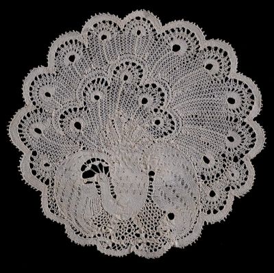 A hunnia csipke technikájának kikísérletezésére a páva motívum volt a legalkalmasabb, ezért ebből több darab is készült (lsd. még 73.242.1.). A páva farktollainak, illetve szárnyainak szabad szálvezetése keratív gondolkodást kíván. Számos terítő, szélcsipke kedvelt mintaeleme.
