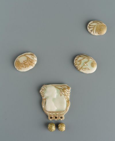 Technika: | áttetsző szeladonmáz; redukáltan égetett, irizáló máz; részben polírozott reliefaranyozás |
