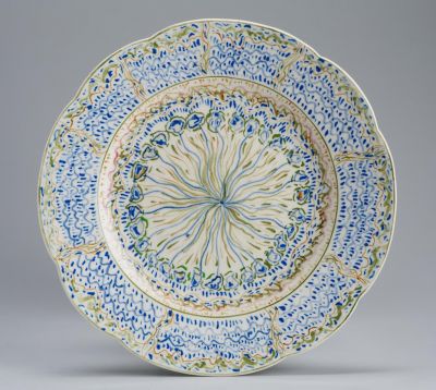 A tányér tükre egyenes, öble lapos, ferdén álló pereme nyolckaréjos. Teljes felületét beborítja az aprólékos, könnyed mintázat, melyet kék, zöld, barna és kevés lila színnel, ecsettel rajzoltak. A tányér tükrében egy pontból induló virágszálak láthatók, az öböl hajlatánál vázlatos virágfejek, négy sormintával keretelve. A tányér peremén kilenc osztásban öt szabálytalan hullámzó sor között apró vonalas, lüktetően ritmikus díszítés. A formát a Zsolnay gyári 4. Façonkönyvben a 2528 sz. alatt rajzolták be, majd a 2655 sz. szerviz részeként jelölték. (A tervezés időpontja: 1889. III. Zsolnay Teréz füzetének adata szerint Janus Panonius Múzeum, ltsz. 1578-91-1584). A Zsolnay gyári Decorkönyvben ez a minta nem szerepel. A tárgyat Rippl-Rónai József fogadott leánya, mint az Andrássy étkészlet egyik darabját ajánlotta fel a múzeumnak.