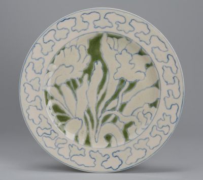 A kerek tányér tükre kissé homorú, öble lapos, enyhén ferdülő pereme sima. Ultramarinkék csík kereteli az öböl és a perem szegélyét, e színnel rajzolták körül a kidomborodó mázas motívumokat. A peremen körben folytatólagos felhőmotívum, a tányér tükrében stilizált krizantémok. A virágtőből széles levelek hajlanak ki, legyezőszerűen szétterülve, két-két lazaszirmú virágfej magasodik fel, egy virágfej jobbra lehajlik. A háttér tompa zöld, a minták kétféle, halvány, szürkészöld színnel festettek. A tányérformát a 431. sz. készlet részeként tervezték, 1877-ben. Díszítésének rajzát a Zsolnay gyári 8. Decorkönyvben 5821 sz. alatt találhatjuk „Rippl-Rónai 1898-ból” bejegyzéssel. A kivitelező festők munkáját gyakran segítették a körvonalak előrajzolásával. Pauszpapíron, ólomlapon kilyuggatták a minta körvonalait, grafitporral bedörzsölve átvitték a díszítendő felületre. Ilyen pauszátvitellel rajzolták be az 5821 sz. rajzot is a Decorkönyvbe. Mivel több apró részletbeli eltérés található az 1913. évi rajz és a festett tányér között, biztosak lehetünk abban, hogy ezt a tányért nem az előrajzolt sablon segítségével festették. A gyári 1898. évi 5. Decorkönyvben csak a krizantémtő vázlatát találjuk a 2730 számnál, szabadkézi rajzzal, bejegyzés nélkül.