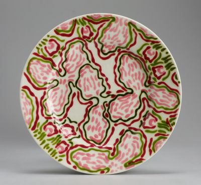 A tányér mintája az 54.1732. ltsz. tányér díszítésének tükörképe, a kézifestés miatt kisebb eltérésekkel. A színes máz jobban kidomborodik a felületből, mint párdarabja esetében.