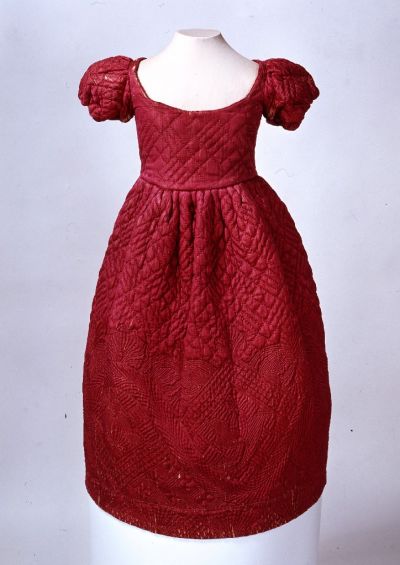 Anyaga sötétvörös atlaszselyem. Emelt derekú, nyak-kivágása lekerekített négyszögű. Szoknyája hosszú, ráncolt, a derékrésszel egy bevarrott. Hátközepén hosszú hasítéka kapcsokkal záródik. Ujja rövid, belefűzött zsinórral összehúzható. Egész felületén geometrikusán letűzött minta. Alján széles bordűr: el-lentétesen vezetett nagy hullám- és zegzug-vonalak, közöttük geometrikusán letűzött alapú tulipánformák, levélmotívumok.