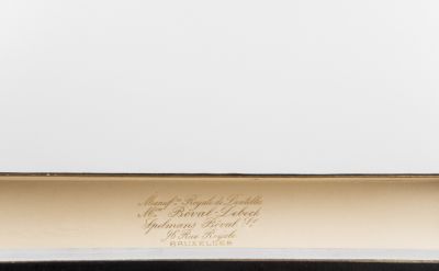 A diszítetlen, fekete selyemmel borított, domború és felhajtható tetejű dobozon belül aranyozott cégjelzés: Manufacture Royale de Dentelles / Boval-Debeck / Spelmans-Boval / S(uccesseu)r / 74 Rue Royale, Bruxelles.