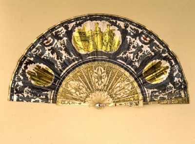 A fehér alapon kék-ezüst színű, leveles, kagylós, rokokó ornamentika formáz három kartust, melyekben kék-arany színű rokokó figurák láthatók: középen, klavikord mellett ülő ifjú csókolja a mellette álló hölgy klavikordon nyugvó kezét, társnőjük egy székre térdel. Baloldalt hölgy, jobboldalt fiatalember ül. A kartusok között zenélő, szárnyas puttók. A hátlapon, középen arany virágcsokor, kétoldalt szőlőág. A kinyitva összefüggő felületet adó küllőkön virágfüzérek között három, négykaréjos mezőben egy-egy nagyméretű virág.