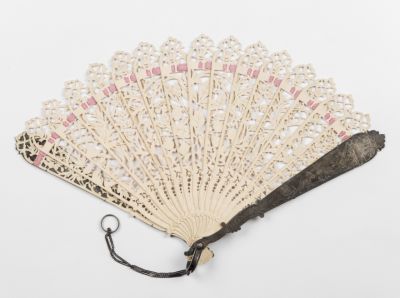 Tizenhét darab áttört celluloidlap, a záróküllők vésett ezüstlappal borítva. A lapokat fölül selyemszalag, alul fémszegecs és ezüstakasztó fogja össze.