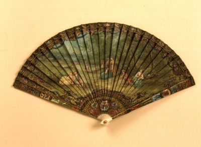 A 18. század első évtizedeiben készült, a távol-keleti lakkfestést utánzó (ún. Vernis Martin) legyezők modorában készült. Előlapján lankás erdőszélen heverésző és sétáló rokokó párok, a háttérben folyón átívelő híd és elszórtan épületek láthatók. Hátoldalán erdőrészlet patakkal és lakóházzal. A jeleneteket elöl rokokó, szalagos, virágsor, hátul egymást metsző, félköríves ornamentika kereteli. A záróküllőkön virágkosár és szerelmi jelvények.