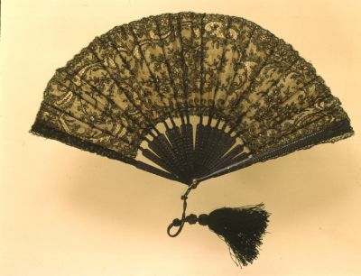 Tizennyolc darab préselt és acélszegecsekkel berakott faküllőn alábélelt gépi csipkelap, flitterdíszítéssel. A küllőket fémszegecs és feketére festett sárgaréz akasztó fogja össze.