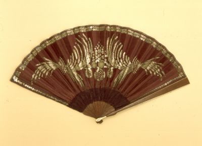 Tizennyolc darab fényezett faküllőn acélflitterrel hímzett atlaszselyem lap. A küllőket gyöngyház alátétes sárgaréz szegecs fogja össze.