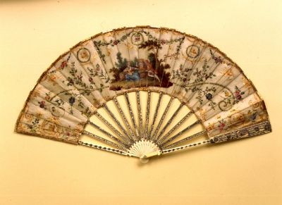 Tizenhat darab áttört, aranyozott ezüst és színes fóliával díszített elefántcsont küllőn gouache festésű és flitterrel hímzett selyemlap. A küllőket ékköves fémszegecs fogja össze.