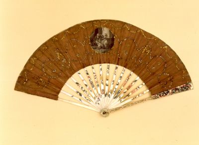 Tizenhat darab faragott és festett elefántcsont küllőn rézmetszettel és flitterrel díszített selyemlap. A küllőket vörösréz alátétes vörösréz szegecs fogja össze.