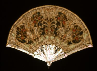 A palmetta alakú lap fehér selyem- és aranyháló kombinációjából kialakított. Szimmetrikus kompozíciója közepén, szökőkútszerűen kibomló, stilizált növényi motívum, melyet két oldalról kagylómotívumokból és virágokból alakított szövevényes ornamentika vesz körül. A különféle alakú - lapos és domború kerek, csillag, virág, mandula - és faktúrájú, apró, aranyos flitterek pompázatos külsőt kölcsönöznek a díszítménynek. A kagylókkal tagolt szélű küllőket virágfüzérek és szalaggal összekötött szerelmi jelvények ékesítik. Hasonló, Duvelleroy-tól jelzett darab – á l’anglaise – összeállításban közölve a Kat. 1985, Nr. 207., 74. kép.