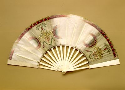 Tizenhat darab csontküllőn akvarellel festett és flitterrel díszített rézmetszetes selyemlap. A küllőket gyöngyház alátétes sárgaréz szegecs fogja össze.