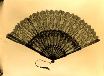 A sajátos kialakítású legyező oly módon van elkészítve, hogy a küllőkre ráillő csipkelapra, még egyszer akkora lap van ráillesztve. Ez utóbbi, mivel mögötte nincs merevítő, lehajlik. Ez a lap fölül, palmettaszerű levelek sorával, a felületén pedig szívformát körülölelő virág- ornamentikával díszes. A fekete küllőket stilizált növényi motívumok díszítik. Az akasztóhoz vékony, fekete selyemzsinór és bojt van kötve. A fölső csipkelap valószínűleg kisebb belgiumi manufaktúra terméke.