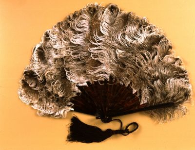 Huszonnégy darab teknőcutánzatú celluloidküllőn strucctoll. A küllőket zsinór, alul fémszegecs és celluloid akasztó fogja össze.