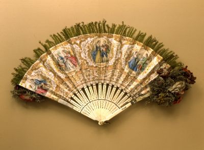 A fehér alapon rózsaszín és arany kagyló-, virág- és indaminta, öt(?) szabálytalan alakú mezőt formáz. Ezekben egy-egy szerelmespár képe (balról jobbra): egymás mellett ülnek, az ifjú felolvas kedvesének, sétálnak, az ifjú útra készen áll kedvese előtt, az utolsó oly töredékes, hogy értelmezhetetlen. A hátlapon, arannyal nyomott jelenet: fiatal, rokokó pár beszélget egy teraszon. A küllők ágas mintázatúak. A záróküllőn többféle virágból összeállított csokor, a lap felső szélét gyöngyvirágok szegélyezik. Hasonló, művirággal díszített legyező a gyűjteményben az IM ltsz. 70.92. Rokon darabot - brisé típusút - közöl Armstrong 1974, 6. kép.