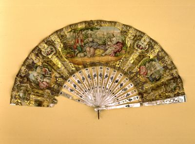 Tizennyolc darab áttört, és aranyozott ezüstfóliával díszített gyöngyház küllőn arany nyomású, és akvarellel festett litográfiával díszített papírlap. A küllőket gyöngyház alátétes sárgaréz szegecs fogja össze.