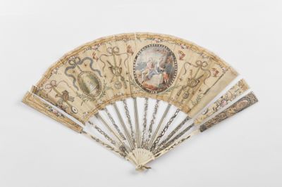 Tizenhat darab áttört, és aranyozott ezüst, valamint színes fóliával díszített elefántcsont küllőn gouache festésű, fémszállal és flitterrel hímzett selyemlap.