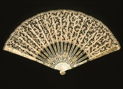 Tizenhét darab áttört, faragott és aranyozott ezüstfóliával díszített elefántcsont küllőn vert csipkelap. A küllőket csontalátétes fémszegecs fogja össze.