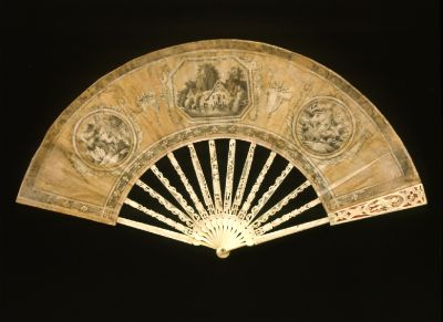 Tizennégy darab áttört és faragott csontküllőn akvarellel festett papírlap. A küllőket gyöngyház alátétes sárgaréz szegecs fogja össze.