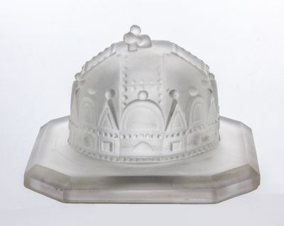 Üveg emléktárgyunk az eredeti koronának csak a formáját, illetve az egyes lemezek körvonalát rögzíti, az ábrázolások teljes mellőzésével. A korona tetején lévő kereszt teljesen ráhajlik a latin koronarész középső mezőjére. A korona üreges, belsejében eredetileg a koronázási domb földjének egy röge volt. Tipikus példánya a nagy számban - sorozatgyártó technikával, préseléssel - készült üveg emléktárgyaknak.