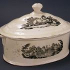Keménycserép. Formába öntött, az ovális edény keskenyebb oldalain a peremnél levő füleket nyers állapotban vágták ki, szárítás után zsengélték a tárgyat, majd ólomboraxos, magas fényűre kiégő mázzal borították. A díszítést rézmetszetről készült levonókép, segítségével vitték át a mázas felületre, majd alacsony hőfokon égették ki a tárgyat.