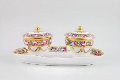 Ovális alakú talapzaton két fedeles edény, pereme arany alapon, rózsákból kialakított festett füzérdísszel.