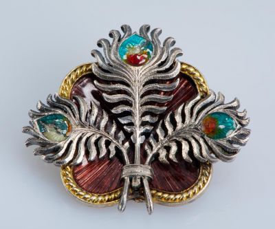 Sodronnyal szegélyezett, barna transzlucid zománccal borított, négykaréjos lapon csokorba kötött három stilizált pávatoll. A két szélső kétoldalra vízszintesen elhajlik. Mindhárom pávaszem túlnyúlik a szegélyen. Aljáról eredetileg gyöngy függött. Szerepelt az O. M. Iparművészeti Társulat 1898. évi karácsonyi kiállításán.