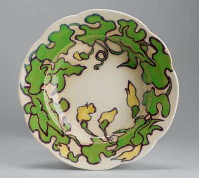 A tányér öble mély, ferdén kihajló pereme nyolckaréjos. Ezen stilizált inda látható, középre is hajló laza zöld levelekkel, sárga bimbókkal. Az árnyalás nélküli színfoltokat érzékeny ecsetvonásokkal húzott vastag kék kontúrvonalak tagolják. A tányér tükre és a perem szegélye törtfehérrel is színezett, a lombok középrészénél, a karima indulásánál áttetszik a sárgás cserép nyers színe.