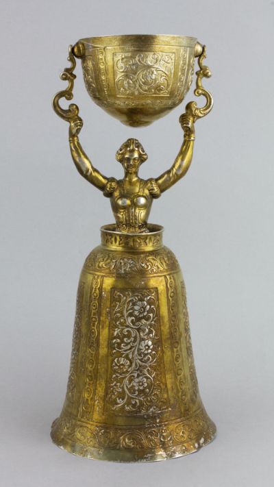 A 17. század egyik legnépszerűbb augsburgi tárgytípusának historizáló változata. A harang idomú szoknyához egy kihajló, peremes tagozat csatlakozik, amely két, felemelt kezében csúcsos, félgömb formájú csészét tartó női félalakot rögzít. A szoknya teljes felületén négy, gyöngysorral és vonalas kerettel elválasztott mezőben virágos indadísz.