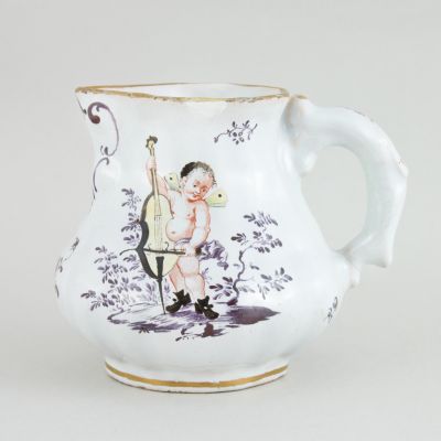 Körte alakú gerezdek test kiöntővel és tagolt füllel. Egyik oldalára csellón játszó lepkeszárnyas puttó, a másikra lanton játszó szárnyas puttó van festve. Színei a mangán árnyalatai, illetve a testrészek világos vasvörös árnyalatúak.