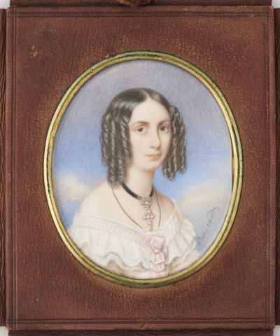 Ismeretlen fiatal nő arcképe, rózsaszín szalaggal és fodorral díszített fehér ruhában, bársonyszalagon függő ékköves nyakékkel. A miniatűr tárcaszerűen szétnyitható barna bőrtokba van befoglalva.