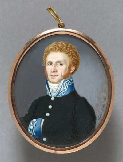 Középkorú, vörös hajú, pofaszakállas férfi arcképe. Fekete uniformisának gallérja és kézelője kék, fehér hímzéssel. Jobb kezét kabátjába mélyeszti. A medalion másik oldalán préselt rézfóliára helyezett kék üveg alapra applikált gyöngyház- és elefántcsont faragványok: urnát tartó fiatal nő térdet hajt egy DON DE L'AMITIÉ feliratú oltár előtt, amelyen áldozati tűz ég. A jelenet fölött két galamb lecsüngő virágfüzért tart. A miniatűr mesterkérdése körüli problémák egyik oka, hogy Franz és Thomas Spitzer oeuvre-jének elkülönítése még nem teljesen tisztázott, mivel a korábbi irodalom minden Spitzer névvel szignált miniatűrt Franz Spitzer művei közé sorolt.