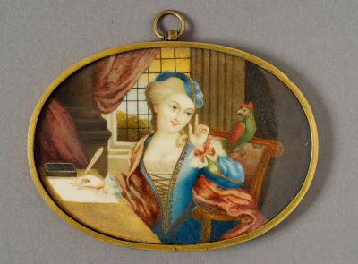 Miniatűr képmás - levelet író hölgy, amint papagáját hallgatásra inti