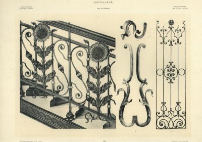 „A 213. rajzlap 1. ábrája lépcsőrácsot, 2. ábrája kapubetét-rácsot ábrázol. Az előbbit Grünwald Mór műépítész terve szerint Árkay Sándor épület- és műlakatos készítette, a másikat pedig Páder Nándor állította elő. Igen érdekes az első ábra színezése [a mintalapon sajnos ez nem követhető nyomon]. A napraforgó szirmai és a kötések aranyozottak, a levelek zöldek és a napraforgó magtartója rozsdavörös. A 3. és 4. ábrában előtűntetett részleteket Jungfer Gyula cs. és kir. udvari műlakatos készítette.”