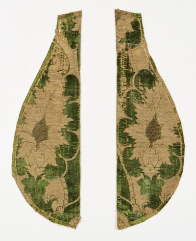 A 7398-as leltárszámú miseruha előlapjának szövete. Egykor hozzá tartozott még az előlap középső, hímzett sávjának két, különböző architektúrájú gótikus baldachin alatt álló, s egyaránt Alexandriai Szent Katalinként azonosítható figurája (karddal, kerékkel): 14964-14965 . ltsz. A miseruha előlapjának eredeti állapotát dokumentáló archív fényképfelvételt ld. IM Adattár NLT 611.