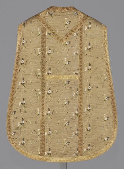Anyag: | aranyszínű paszomány; bordázott selyemszövet (ún. selyemripsz); bouillon; flitter; selyemfonal; üvegkő |