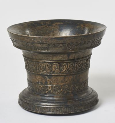 Külső felületén vízszintes gyűrűtagok, ezeken stilizált inda- és levéldíszekből, szalagfonatokból összeállított gazdag dekoratív ornamentika látható. Majuszkulás felirat a talpperem felett: REGNIER BLONDEL MA FAICT TANT QUE VIVRAI JE SERVIRAI. Évszáma a felső gyűrűs tagozaton: 1582. Készítőjét, a jeles arras-i harangöntőmestert a nemzetközi szakirodalom számon tartja (Allgemeines Künstlerlexikon. Hrsg. U. Thieme-F. Becker. 4. köt. Leipzig, 1910. 137. p.). Munkáinak oeuvre-katalógusa, illetve egyéb feldolgozása azonban nem ismert.