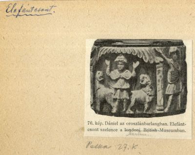 Műlap - 1., elefántcsont szelence Dániel az oroszlánbarlangban jelenettel; 2., Krisztus alakja a cahors-i székesegyház kaputimpanonjából
