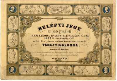 Műlap - belépti jegy az Iparegyesületi rajz Tanoda iparos fiatalsága által 1847-ik évi Február 2án n. Kis Pest városa redoute termében tartandó Táncvigalomba