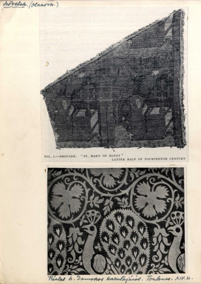 Műlap - brokát Egyiptomi Szent Mária alakjával és részlet Szent Domonkos kazulájáról, XIV.sz. Toulouse